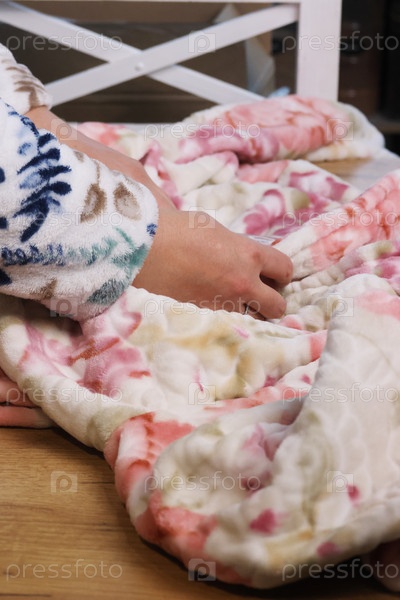 Женщина рассматривает теплый халат. Крупный план. Косой ракурс
