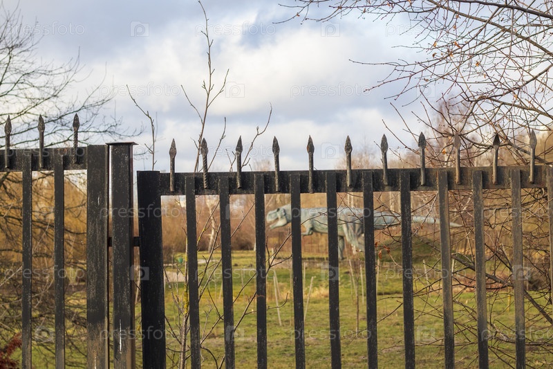 Снимок скульптуры динозавра за забором. Концепция