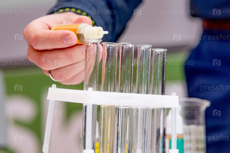 Ученый в лаборатории наливает жидкость в стеклянную колбу, помощник проводит эксперимент