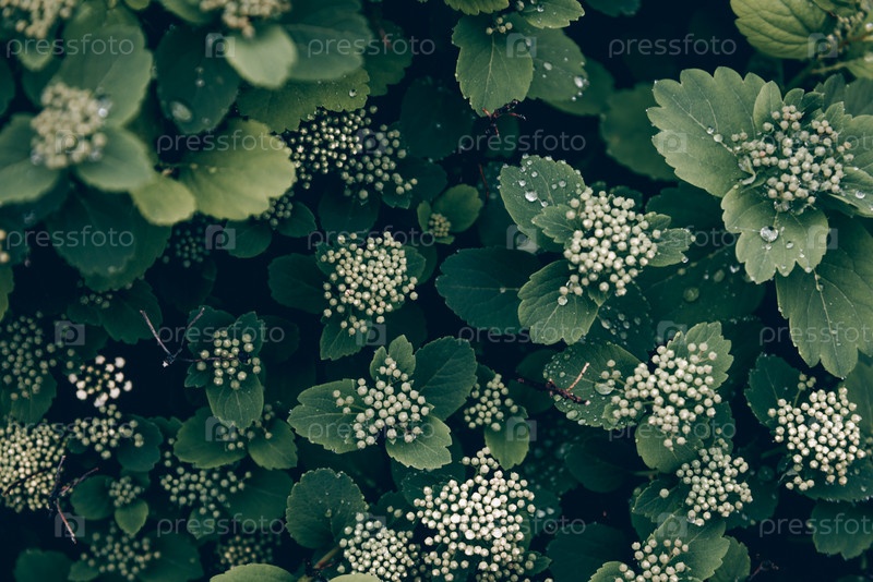 Белые маленькие полевые цветы с большими зелеными листьями пасмурный день в лесу