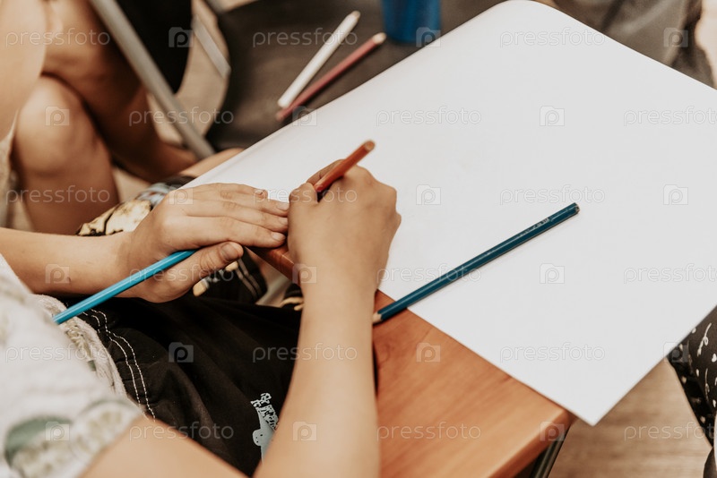 Ребенок рисует цветным карандашом на бумаге, ребенок в детском саду, дошкольное образование