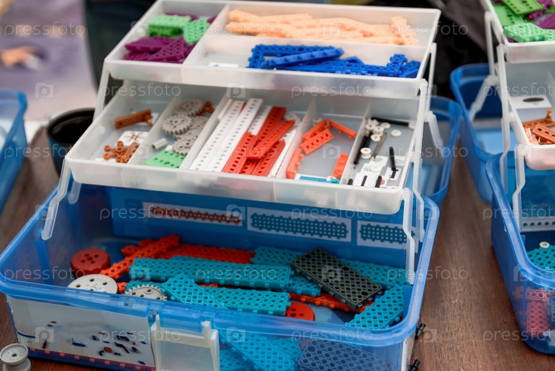 Детали цветного детского конструктора в белом корпусе, игрушки в детском саду