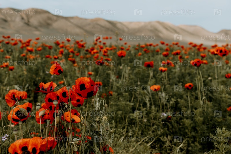 Цветные красные полевые цветы мака, растущие на лугу крупным планом, природный ландшафт