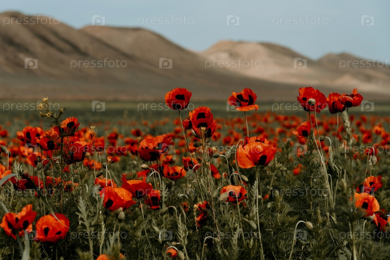 Цветные красные полевые цветы мака, растущие на лугу крупным планом, природный ландшафт