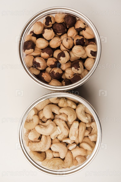 Кешью и фундук в банке на белом фоне