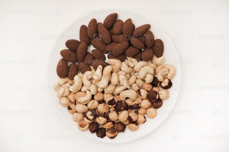 Кешью и фундук миндаль в какао в банке на белом фоне. Орехи на тарелке