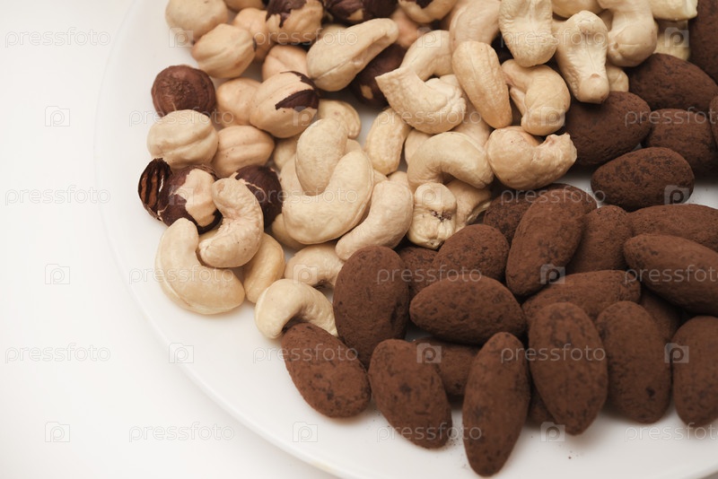Кешью и фундук миндаль в какао в банке на белом фоне. Орехи на тарелке