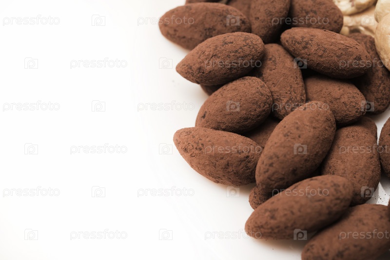 Кешью и фундук миндаль в какао в банке на белом фоне. Орехи на тарелке