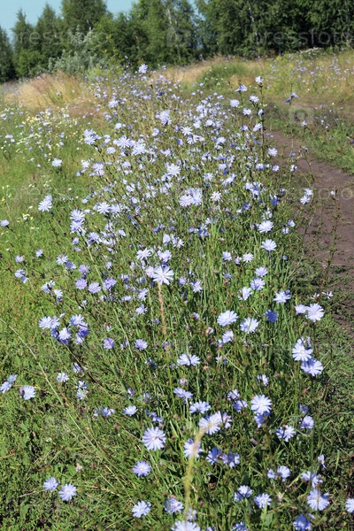 Полянка голубого цикория (лекарственное растение) цветет вдоль лесной дороги
