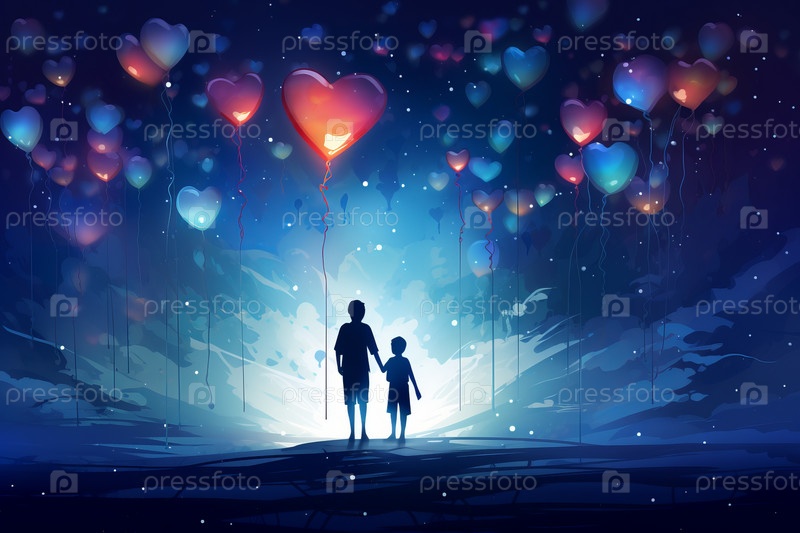 Два силуэта держатся за руки, ребенок маленький и одет в красную рубашку, а взрослый в черную футболку стоит на вершине холма с воздушным шаром в форме сердца в форме дерева, парящим в небе, полным светящихся сердец, летающих вокруг них, романтическая сце