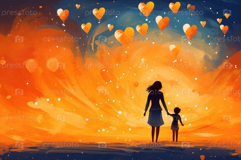 Два силуэта держатся за руки, ребенок маленький и одет в красную рубашку, а взрослый в черную футболку стоит на вершине холма с воздушным шаром в форме сердца в форме дерева, парящим в небе, полным светящихся сердец, летающих вокруг них, романтическая сце