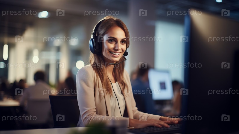 Молодая дружелюбная женщина-оператор с гарнитурой, работающая в колл-центре