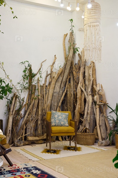 Уютный уголок в богемном стиле с натуральными элементами декора, создающими расслабляющую атмосферу