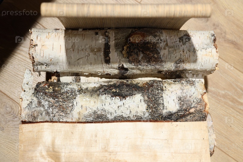 Натуральные березовые поленья, выставленные на красивой деревянной поверхности для творческого вдохновения