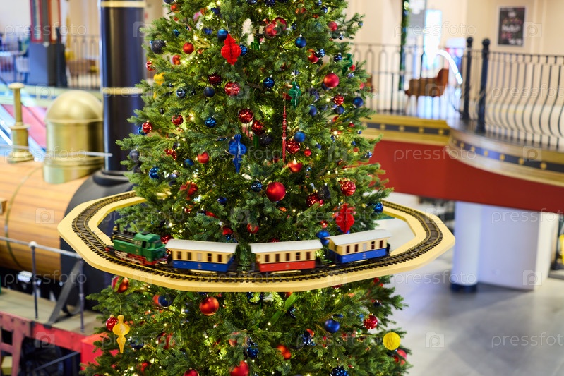 Красивая рождественская елка, украшенная игрушечным поездом, в веселой праздничной обстановке
