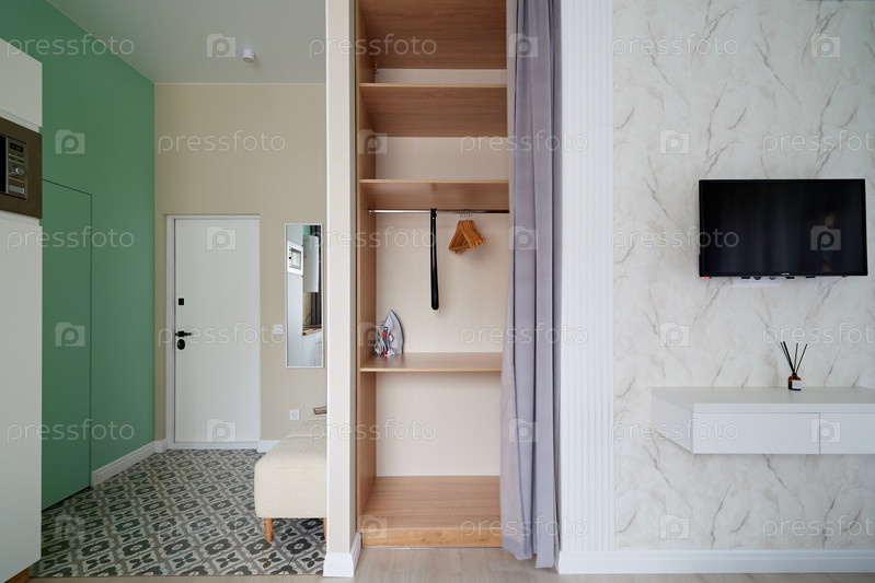 Современный дизайн интерьера. Стильное жилое пространство с телевизором и функциональным шкафом