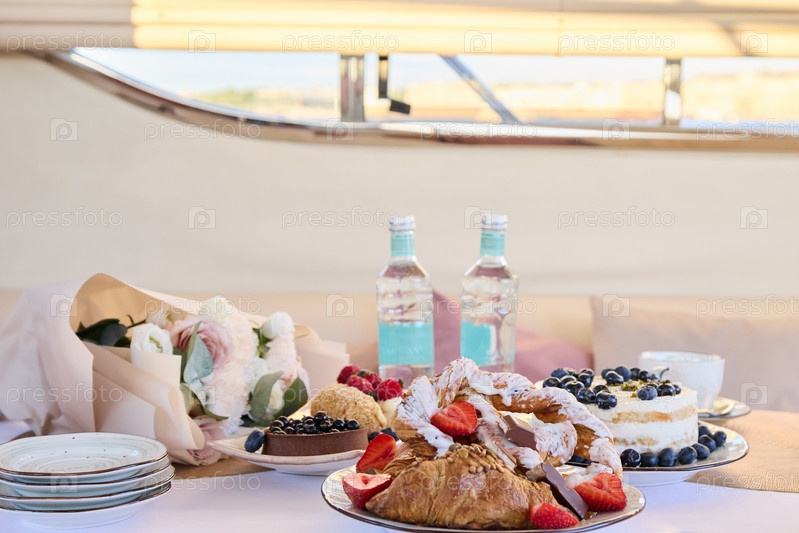 Наслаждайтесь прекрасным завтраком на яхте с разнообразными вкусными угощениями в элегантной обстановке