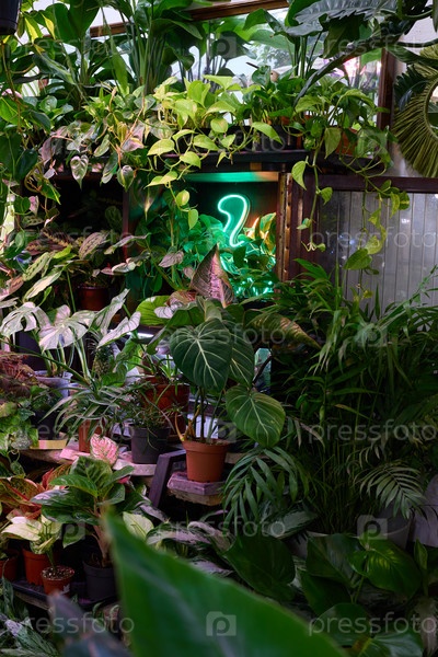 Яркие и пышные тропические растения, освещенные стильной неоновой вывеской внутри уютной оранжереи