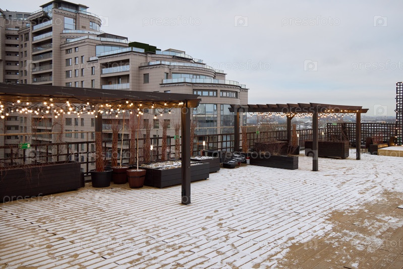 Зимний лаундж на крыше с живописным видом на город, идеально подходящий для отдыха и развлечений