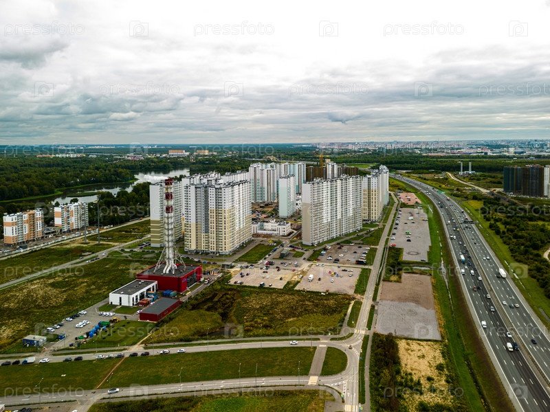 Городской ландшафт с оживленной автомагистралью и различными жилыми зданиями