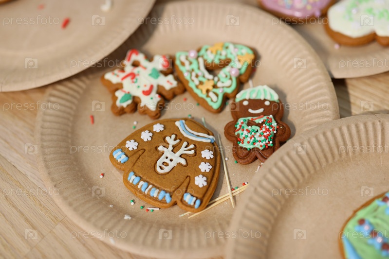 Красиво украшенное праздничное печенье, разложенное на красочных тарелках для праздничного торжества