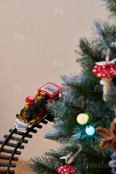 Отправьтесь в праздничное путешествие на причудливом поезде, который движется вокруг рождественской елки