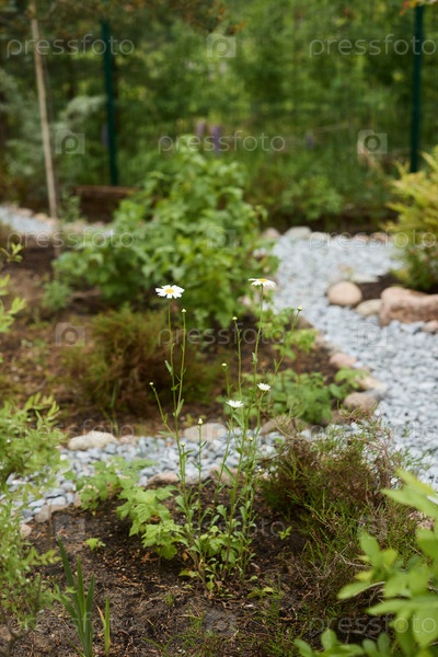 Спокойная садовая дорожка с полевыми цветами, красиво расположенными вдоль гравия