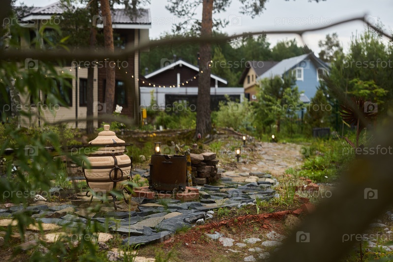 Тихая садовая дорожка, окруженная красивыми и очаровательными домами поблизости