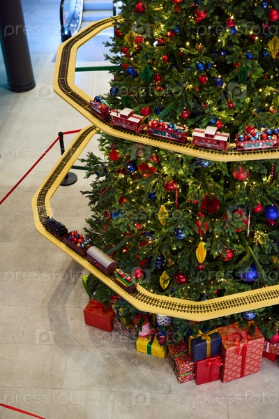 Красивая праздничная рождественская елка, украшенная очаровательным праздничным поездом и восхитительными подарками
