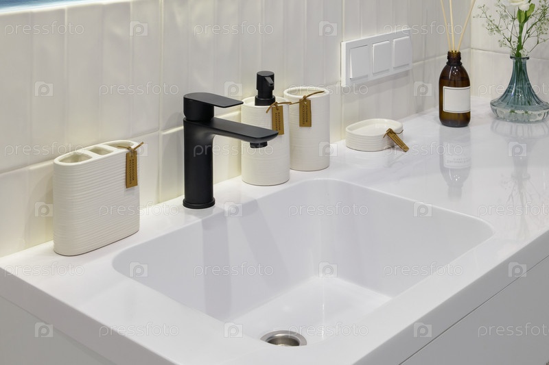 Современная раковина для ванной комнаты со стильными аксессуарами и современным черным краном