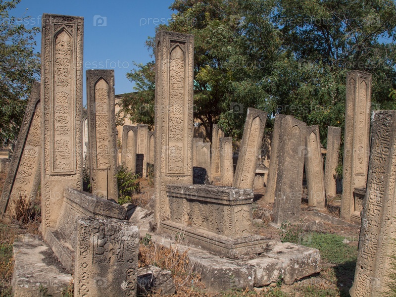 Старинные мусульманские надгробия около мавзолея Тути-Бике на кладбище Кырхляр в Дербенте, Дагестан, Россия
