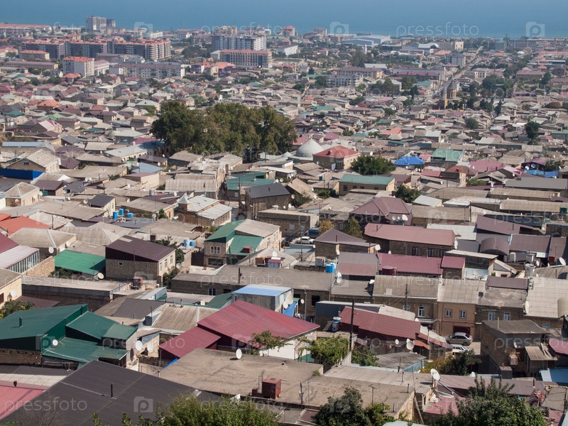 Общий вид сверху на старый город и новые кварталы в Дербенте с Каспийским морем на заднем плане, Дагестан, Россия