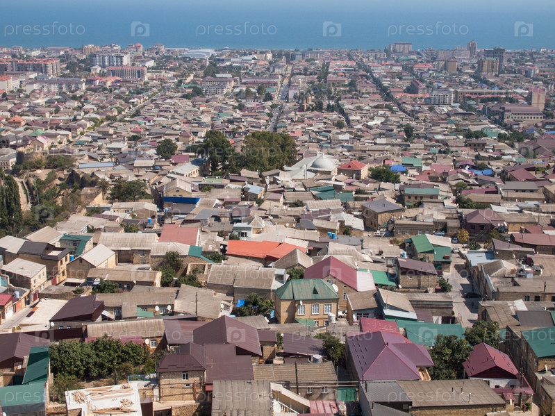 Общий вид сверху на старый город и новые кварталы в Дербенте с Каспийским морем на заднем плане, Дагестан, Россия