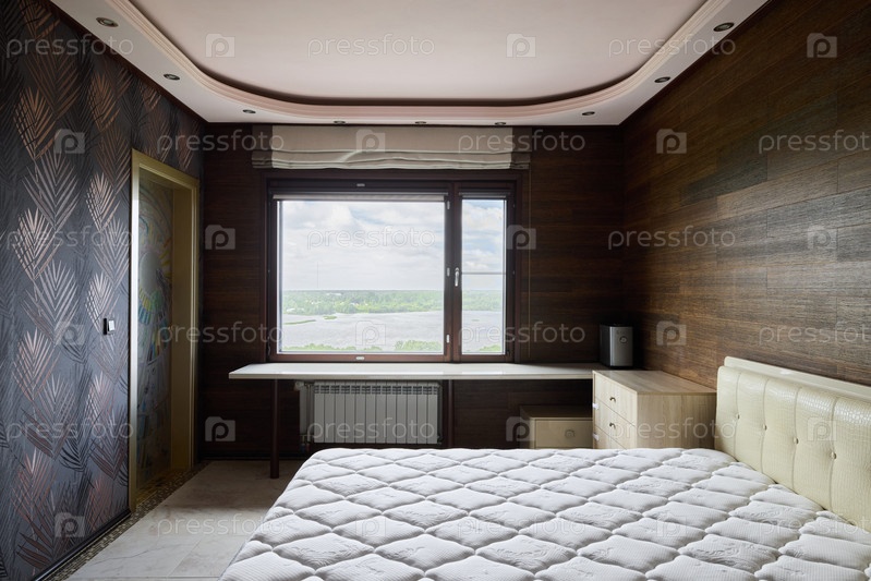Прекрасно спроектированный современный минималистский интерьер спальни, демонстрирующий естественное освещение