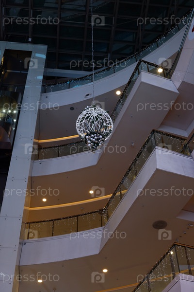 Элегантный вестибюль украшен потрясающей современной люстрой и открытой лестницей