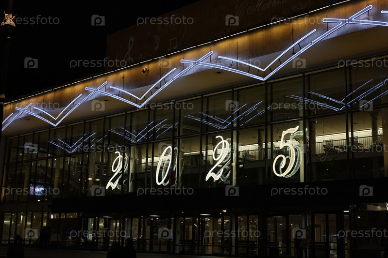 Художественная и светящаяся вывеска 2025 года, светящаяся ночью на оживленной городской площади