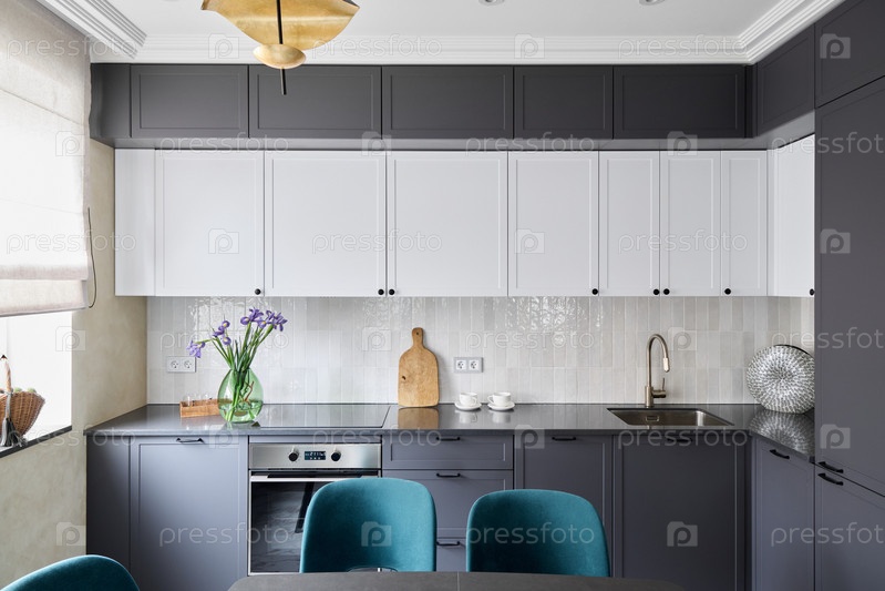 Откройте для себя современный дизайн кухни с элегантными серо-белыми шкафами, которые украсят любое пространство