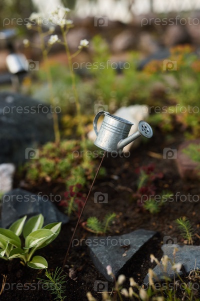 Очаровательная миниатюрная лейка, установленная в пышном саду, идеально подходит для украшения открытого пространства