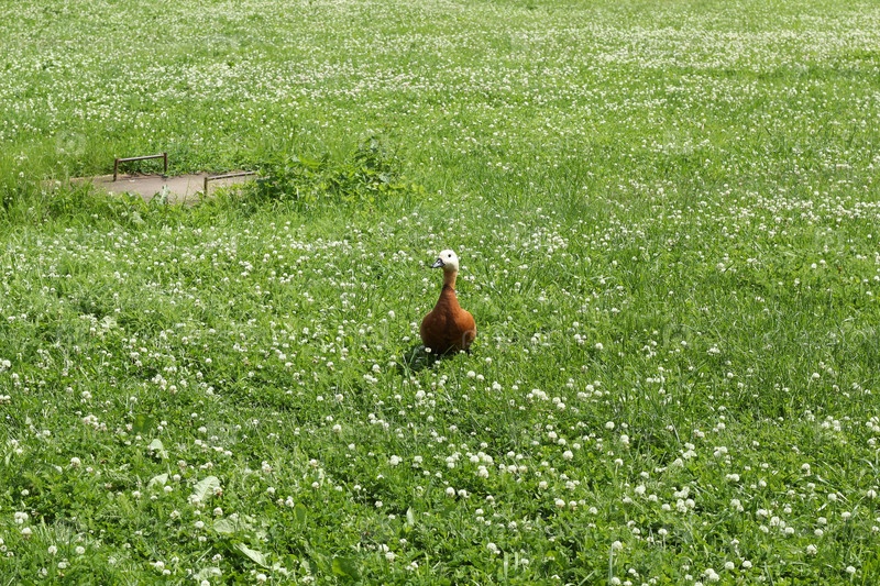 Одинокая утка на цветущем зеленом поле живописного сельского пейзажа