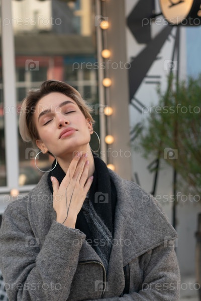 Портрет молодой красивой женщины на улице в сером пальто