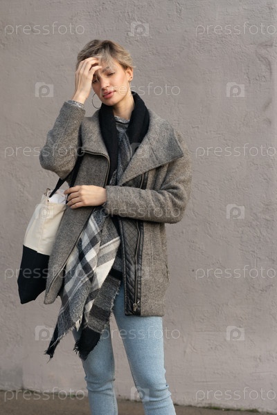 Портрет молодой красивой женщины на улице в сером пальто