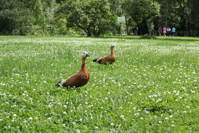 Стая уток счастливо пасется на пышном, ярко-зеленом лугу в красивом парке