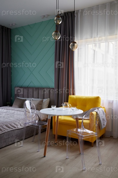 Современная уютная спальня с желтым акцентным креслом и элегантным декором
