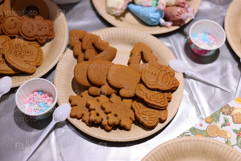 Вкусные праздничные имбирные пряники, разложенные на тарелках с красочной и забавной посыпкой сверху