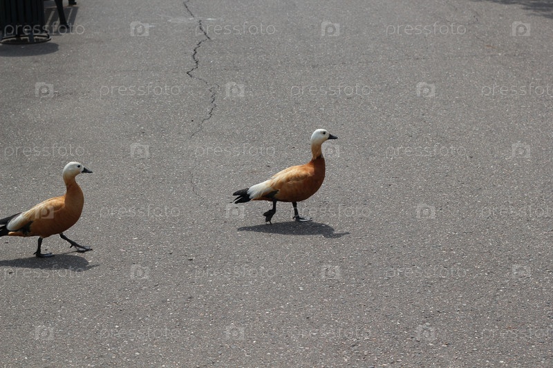 Утки с удовольствием гуляют по мощеной дорожке под ярким солнечным светом, создавая яркую картину