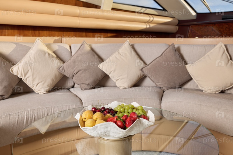 Элегантная гостиная, украшенная плюшевыми подушками и прекрасной композицией из свежих фруктов