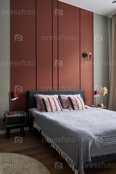 В этой современной спальне стильная акцентная стена сочетается с уютным декором, который располагает к отдыху