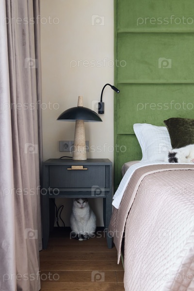 Уютная сцена в спальне с кошкой и мягкой кроватью со стильным зеленым изголовьем