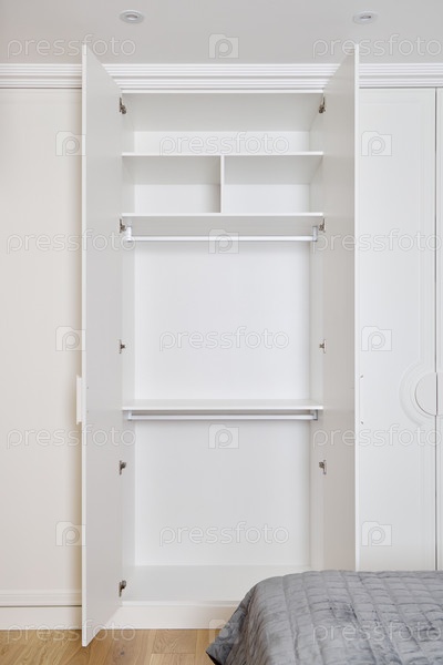 Стильный и современный минималистский гардероб с организованными полками и штангой для вешалок