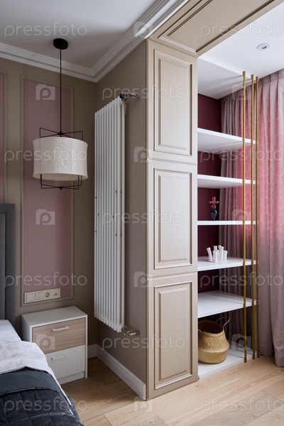 Современная спальня со стильными полками и красивыми, элегантными элементами декора